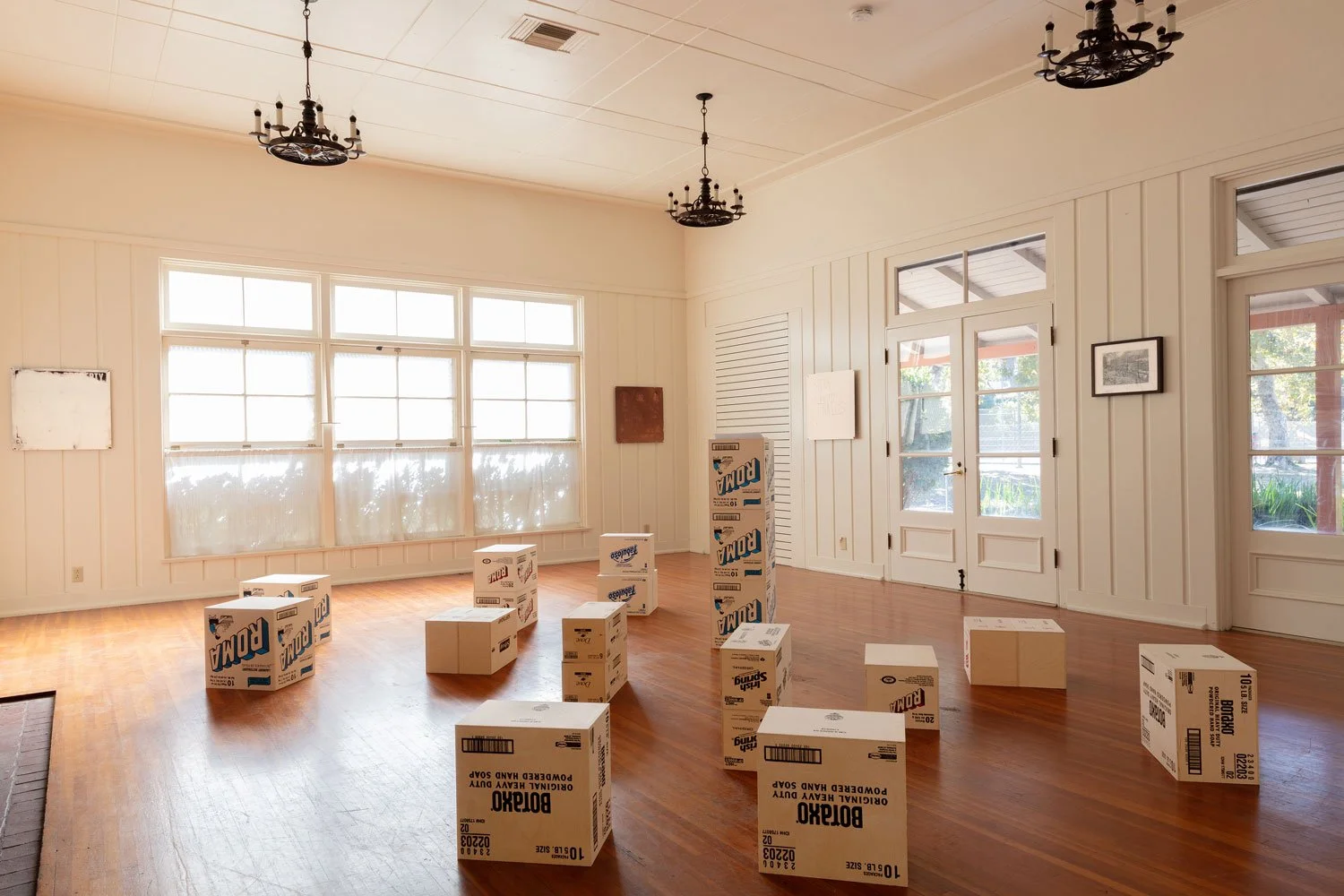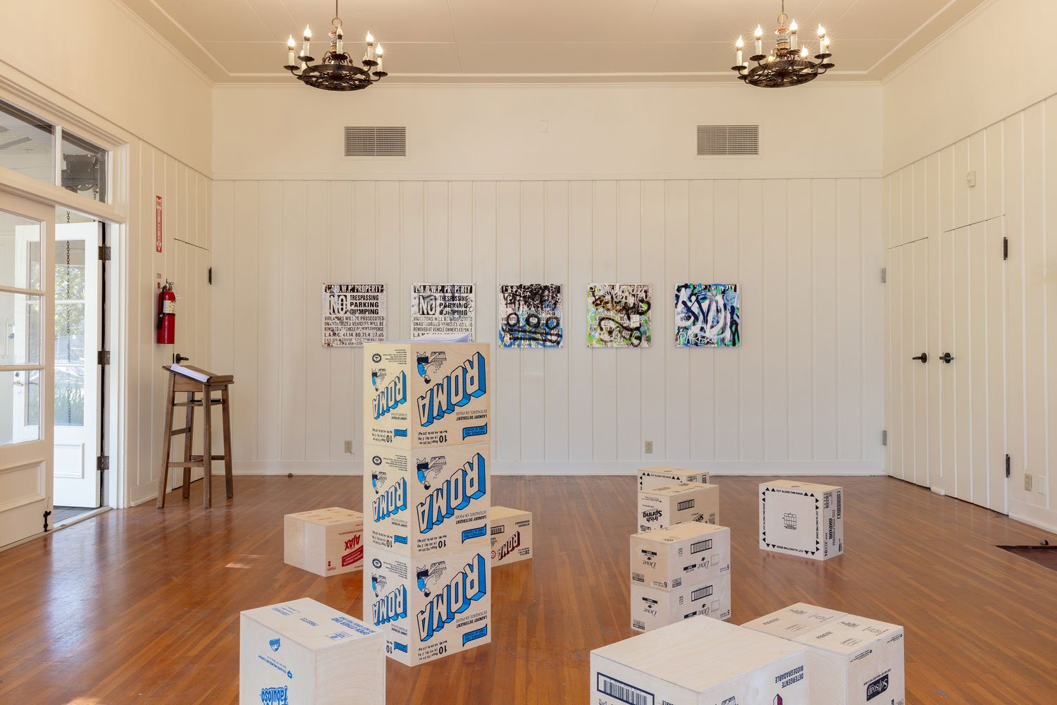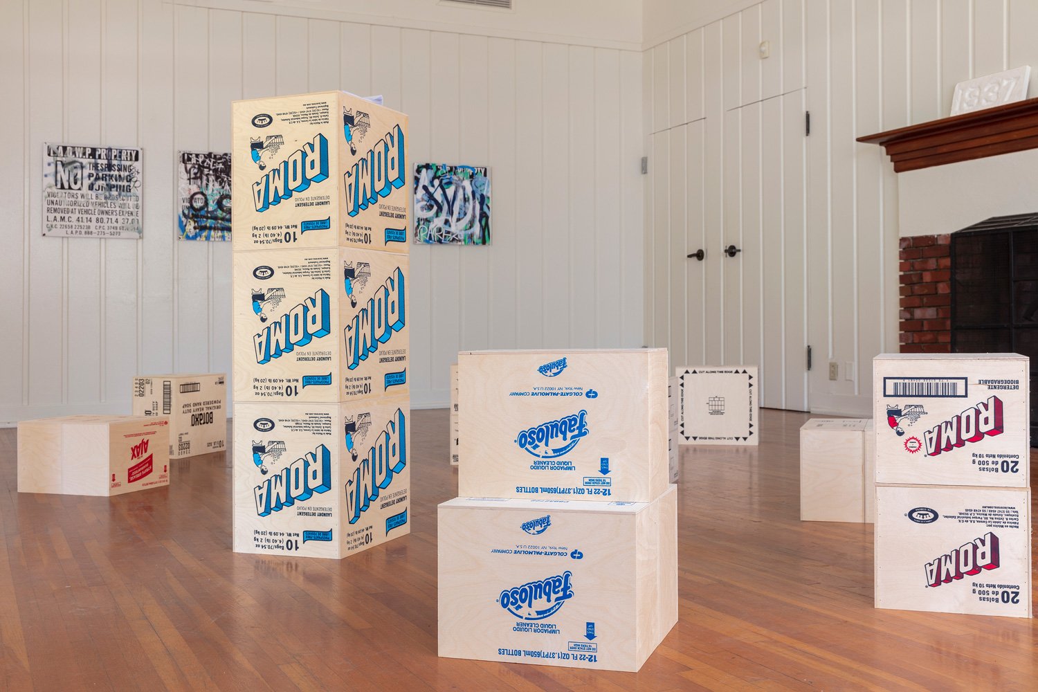 Upon entering the gallery, one first encounters a series of plywood boxes, sculptures screen-printed with the graphic logos of soap and detergent brands. Flipped upside down, Weldzius’s soapboxes recall the makeshift crates that agitators once preached from—in public parks and on street corners—since the early nineteenth century. While soapboxes have traditionally been used to galvanize political and spiritual communities, they are equally marked by the interests of commerce—an apt analogy to the exercise of free speech on social media platforms. Undeterred by the predictable antagonisms of direct democracy, Weldzius offers his platforms for spontaneous acts of expression, inviting speakers and listeners alike to consider the value of the spaces that we occupy and maintain in common.