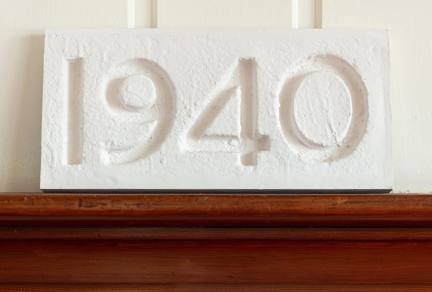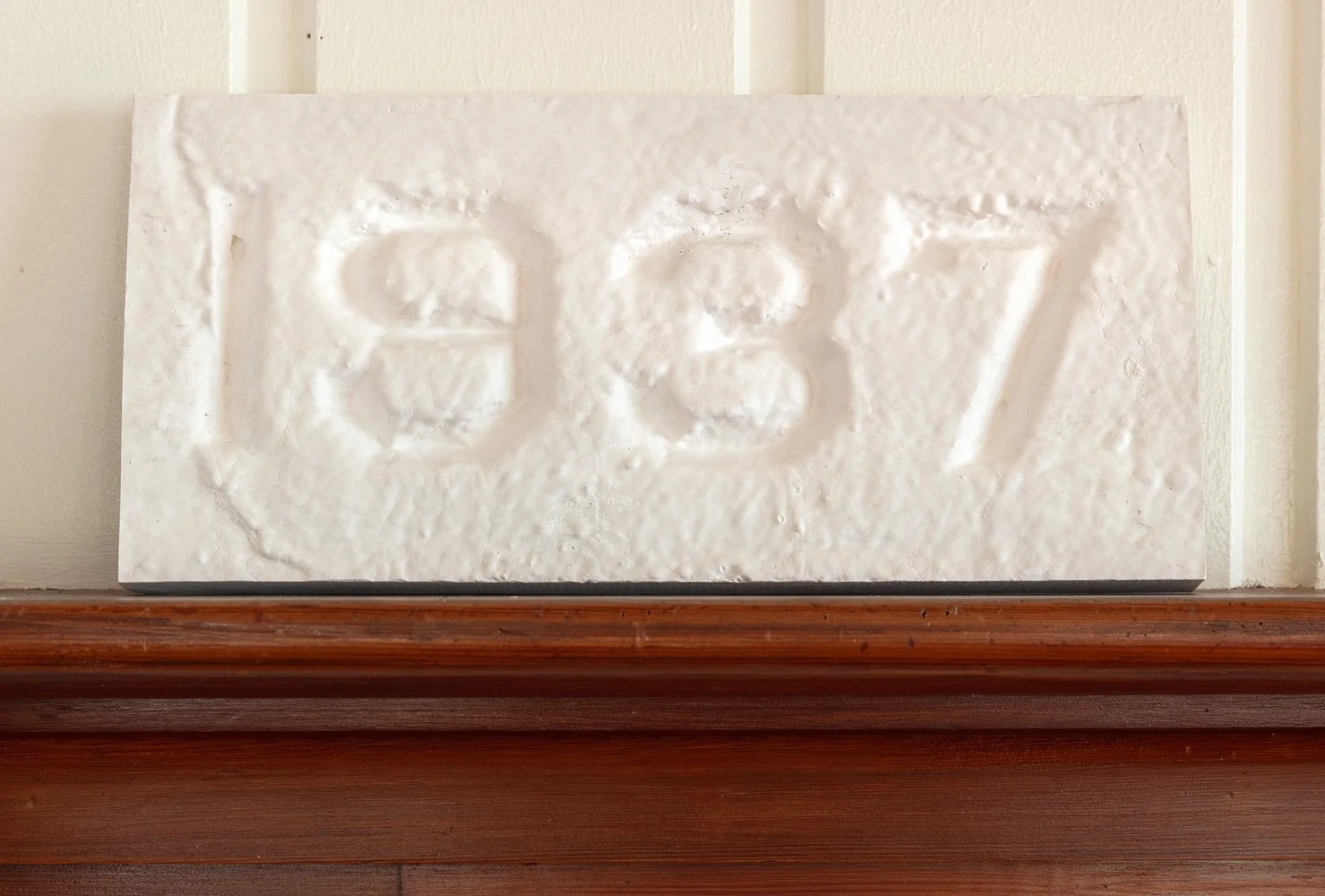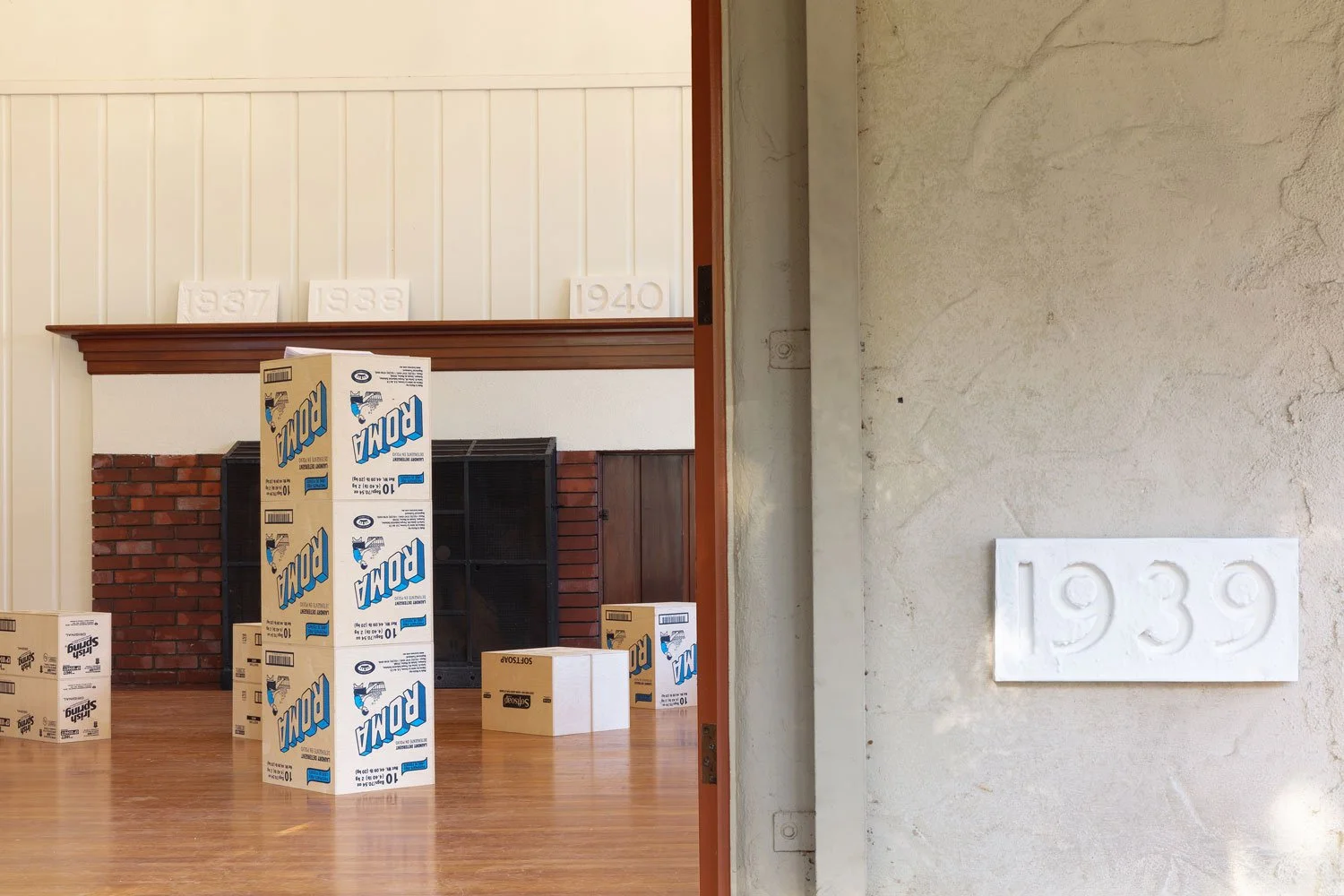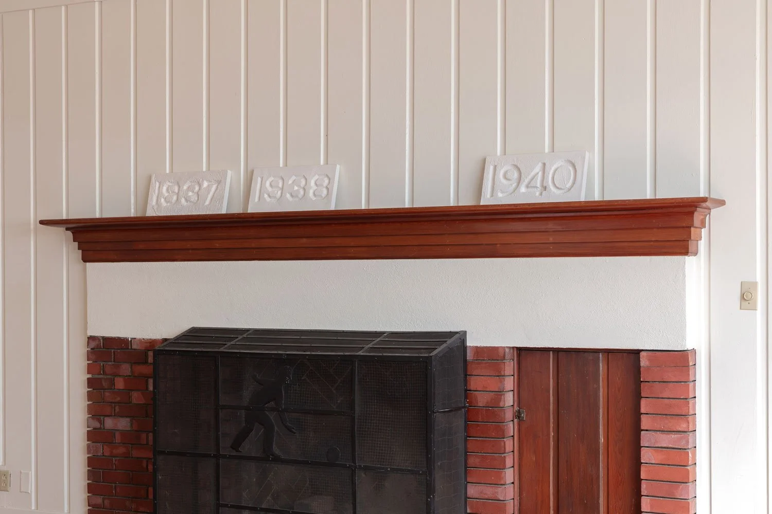 The municipal building where Art in the Park is headquartered was originally a clubhouse for lawn bowlers. The surrounding park and the nearby freeway were constructed by local workers under the auspices of the Works Progress Administration, which provided employment during the Great Depression. Weldzius has displayed works from his series Relief on the fireplace mantel. Relief consists of plaster copies of the dates 1937 through 1940, impressed on the concrete parapets of nearby freeway overpasses. Weldzius has enmeshed “1939,” a plasterwork that marks the building’s year of construction, with the façade of Art in the Park.